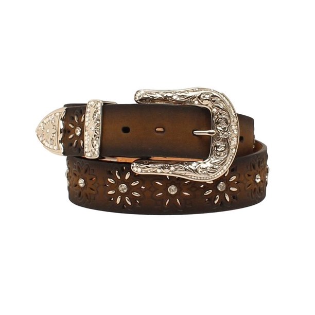 This Ariat women's belt is constructed of genuine leather with a dark brown laced design and a silver starburst beaded pattern. Belt measures 1 1/2" wide.