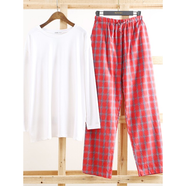 Autumn Long Sleeve Cotton Plain Color Top Plaid Pajama Set