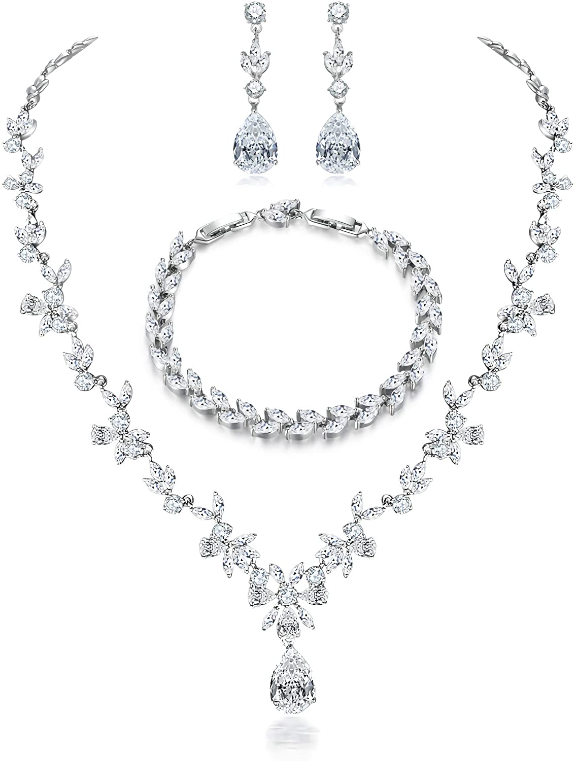 Hadskiss Jewelry Set for Women, Necklace Dangle Earrings Bracelet Set, White Gold Plated Jewelry Set with White AAA Cubic Zirconia, Allergy Free Wedding Party Jewelry for Bridal Bridesmaid