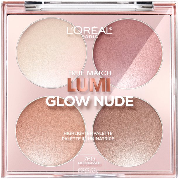 L'Oreal Paris True Match Lumi Glow Nude highlighting kit creates the perfect multi-dimensional sculpted glow look. The collection of four highlighting powders in one makeup kit instantly awakens complexion. Layer or mix and match shades to create a multi-dimensional glow or wear them separately for a natural illuminated look. Moon kissed Palette: Moon Glowing ivory with a pearl finish to highlight. Venus Luminous rose with a radiant finish to blush. Jupiter Radiant taupe with a natural finish to bronze. Twilight Shimmery bronze with an illuminating finish to bronze. Sunkissed Palette: Starlight- Bright sand with a pearl finish to highlight. Sun Soft peach with a radiant finish to blush. Dawn Luminous amber with a natural finish to bronze. Saturn Vibrant gold with an illuminating finish to bronze.