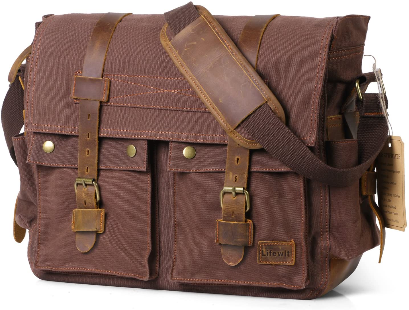 Holds up to a 13” laptopMade of quality canvas and leatherBuckle clasps for maximum safety
